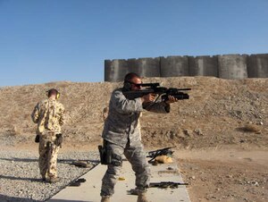 Major Robert Baird, 507th Security Forces Squadron commander is shown practicing at a weapons range while deployed at Afghanistan. Above he is firing an Australian Steyr AUG automatic rifle. Regarding the rifle Major Baird said, "There's no selector switch so you have to push the trigger to the rear