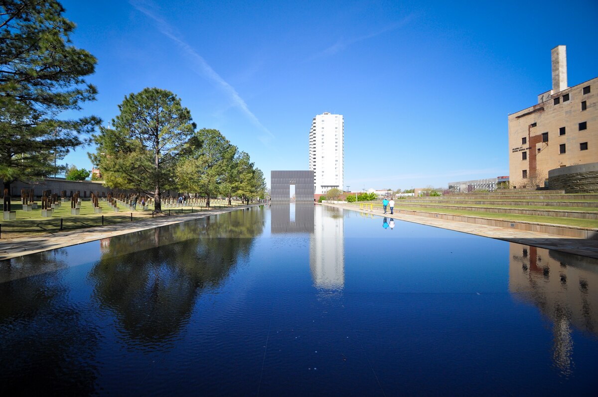 Nineteen years after the bombing of the Alfred P. Murrah Federal Building, the Reflecting Pool, running east/west along what used to be N.W. 5th Ave., is still a place for many visitors to come and take time to reflect upon that tragic morning. The Field of Empty Chairs is located on the south side of the Reflecting Pool. The 168 empty chairs represent the lives taken on April 19, 1995. They stand in nine rows, representing each floor of the building with the name of someone killed on that floor. Nineteen smaller chairs stand to represent the children who perished that morning. The Field of Empty Chairs sits on the ground the Alfred P. Murrah Federal Building once occupied. To the north of the Reflecting Pool is the Memorial Museum. The museum was once the home of the Journal Record which was built in 1923 and withstood the bombing and is now listed on the National Register of Historic Places. At the far west end of the pool is one of two Gates of Time. The west end gate is etched with the time 9:03. This represents the moment after the bombing in which so many were changed forever and the hope that came from the horror in the moments and days following. On the other side if that wall is scribed: “We come here to remember those who were killed, those who survived and those changed forever. May all who leave here know the impact of violence. May this memorial offer comfort, strength, peace, hope and serenity.” (U.S. Air Force photo/Senior Airman Mark Hybers)